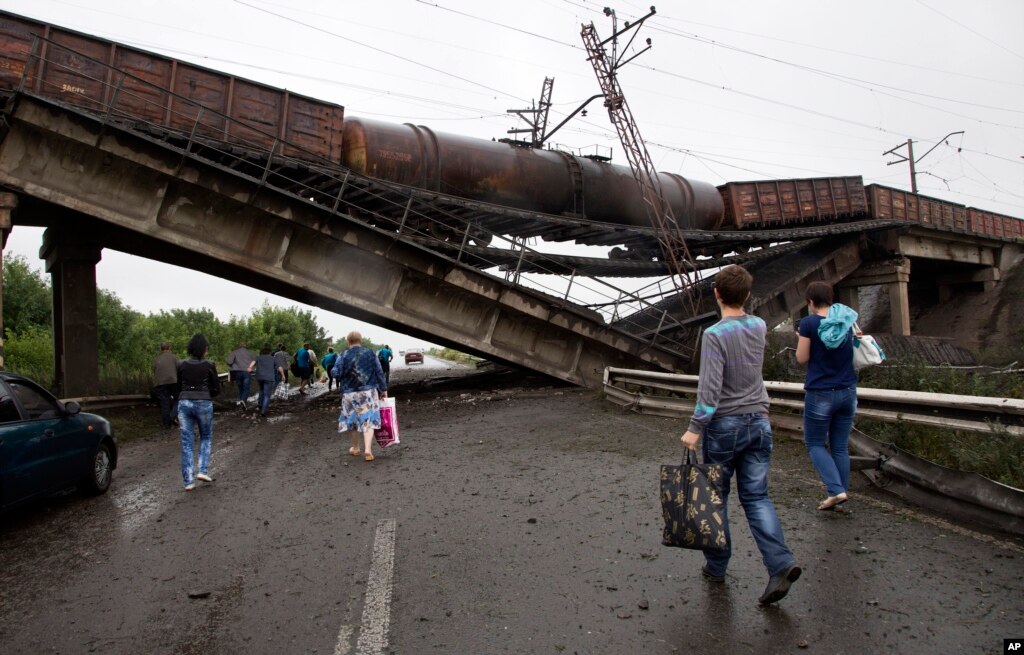 Фото взорванного ж\д моста с повисшим в воздухе товарняком: |