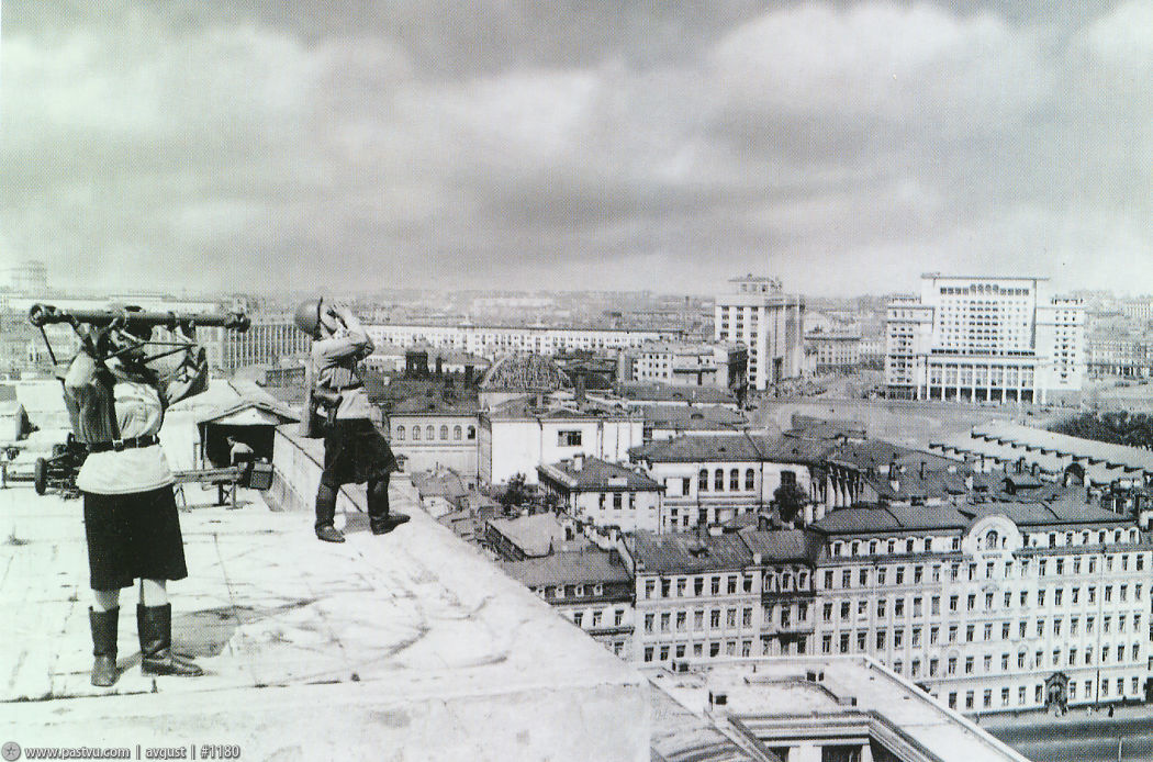 Точно, книгохранилище (Староваганьковский 3/5 стр 5). Вот еще фотография с этой же крыши. Девушки из ВНОС, приблизительно 43 год, за заднем плане тоже ЗУ, на крыше характерная плитка. Привязка 100%, с крыши отлично видно приемную старика Калинина. |