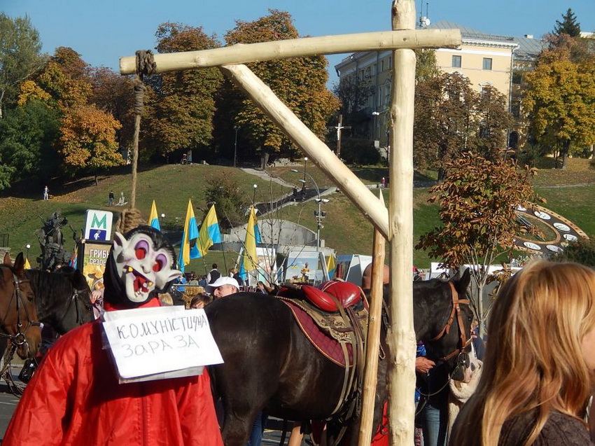 Коммунисты не вешали чучело украинца. Или чучело свидомого. У них шла речь о преступнике (осужденным польским судом), призывать вешать которого уже поздно. А на празднике в Киеве призывали вешать вполне современных, ныне живущих людей, по признаку их политической ориентации. И, чтобы далеко не ходить, вешать по национальному признаку (см. лицо "коммуниста"). |