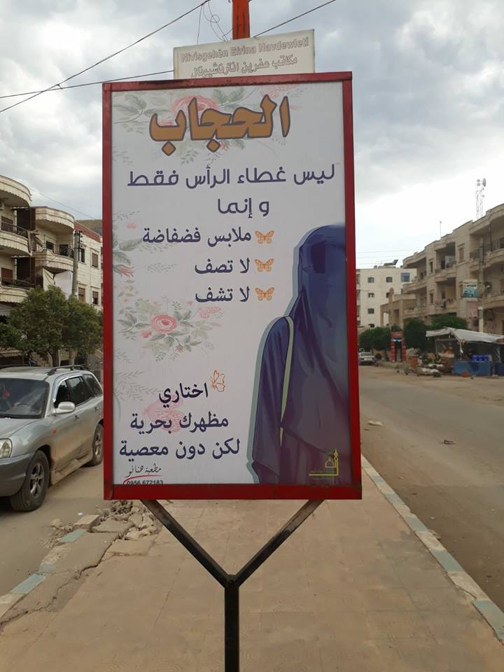 Туркобасмачи в Африне установили плакаты с правилами ношения одежды. Женщины должны носить хиджаб: |