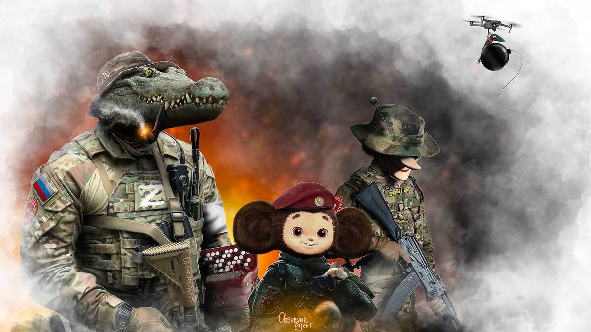 2. У Чебурашки в руках рыжий котик - намёк на известный мем - Вежливые люди, Крым в 2014: Плюс куча других подобных, гугли- Крым 2014 кот 3. К Лариске приглядись внимательнее. Летит (управляемо) на квадрокоптере, а в руках лапках у неё отнюдь не шарик с ниточкой, а бомбочка с бикфордовым шнурочком. То есть Лариска и прицел и механизм сбрасывания одновременно. |