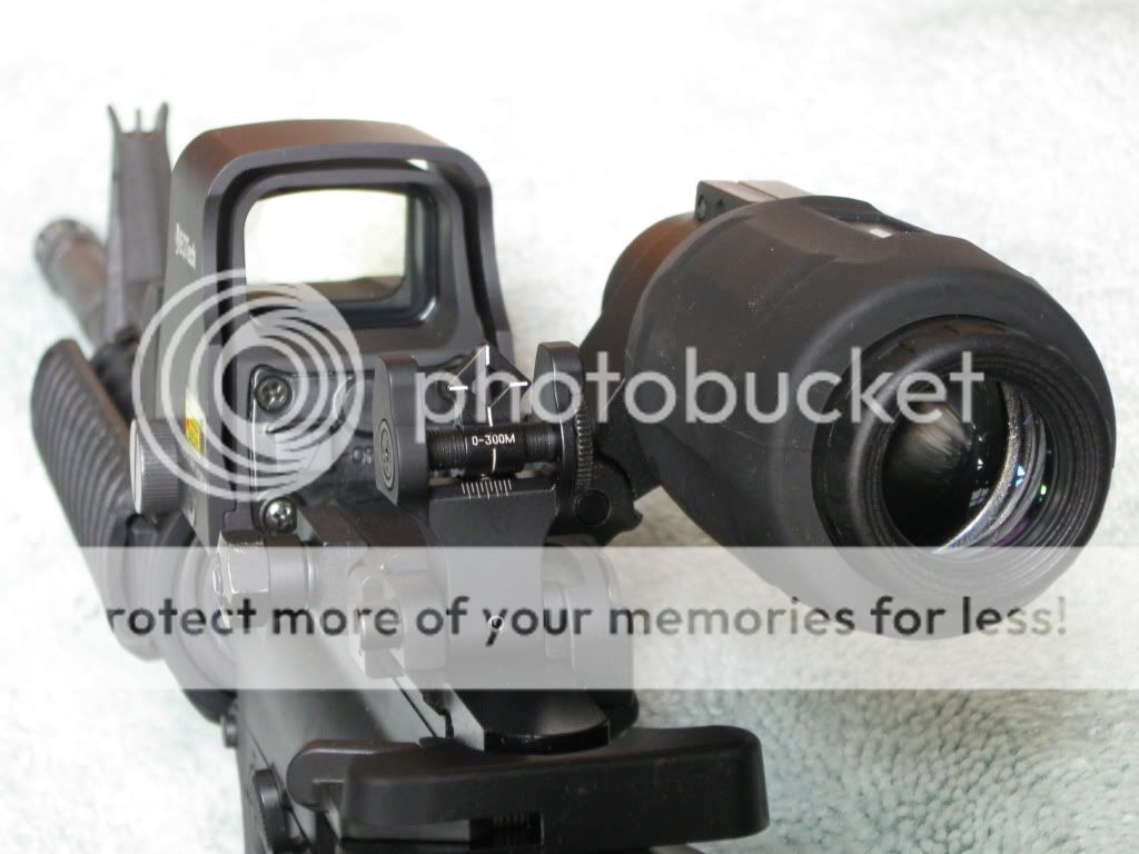 На цевье просто лазерная подсветка AN/PEQ-2. На аппере ствольной коробке коллиматор с увеличителем. На ближней дистанции увеличитель откидывается с линии прицеливания, на дальней обратно, вот так