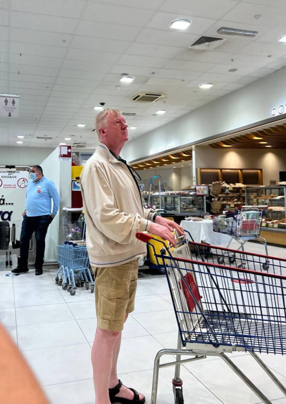 Лимассол, Кипр. Российский пенсионер с пустой тележкой в магазине смотрит что бы спереть смотрит на товар и цены.