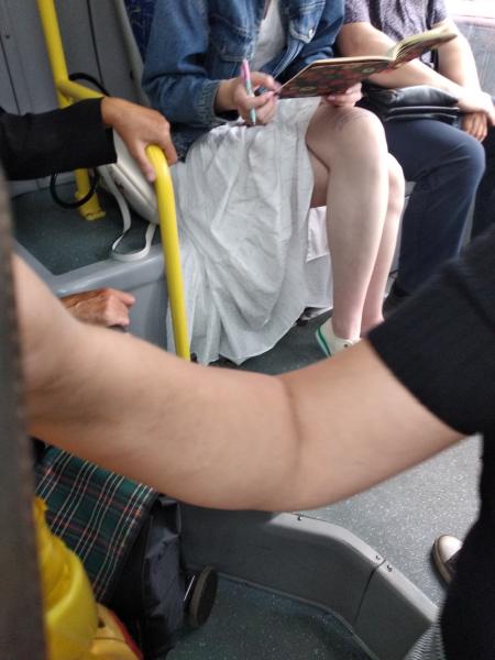 Старый анекдот в жизнь: девушка в утренней маршрутке пишет "шпору" себе на коленке.  |