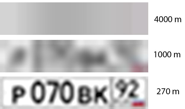 Угловой размер объекта (в радианах), в случае если объект маленький (h-линейный размер объекта) в сравнении с расстоянием (L), на которое он отстоит от наблюдателя, можно примерно оценить как h/L. Тогда, в соответствии с критерием Релея, упрощая формулу для малых угловых размеров (где sin x ~= x), получаем теоретический предел еще разрешаемого объекта (т.е. в этом случае, расположенные на расстоянии h две точки или линии еще можно различить). h = 1.22*lambda*L/D Здесь lambda - длина волны, D - диаметр объектива. Возьмем для длины волны видимого света среднее значение 600 нм, т.е. 600e-9 м. Тогда для объектива диаметром 30 мм (это уже не совсем мыльница) и 4 км получаем h = 10 см. Т.е. меньше 10 объекты на таком расстоянии различить невозможно. Например, расстояние между цифрами номера (и распознаваемые детали цифр номера) больше. Кроме того, 10 см это излишне идеализированное значение. Абсолютно идеальной оптики нет даже на спутниках видовой разведки, ее просто невозможно сделать. Следует учитывать неоднородность атмосферы, то, что объект (автомобиль) движется, угол съемки и т.д. и т.п. Т.е. такие "успехи" могут быть только в случае использования "секретной физики", или на уровне сказок :) Цитата: