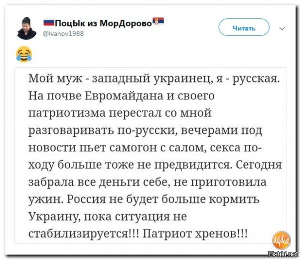 А вот в конце 80-х уже начало потихоньку всё меняться в нехорошую сторону. Теперь же всё кардинально поменялось. И те обороты речи, которые ранее казались "смешными", не выглядят уже такими. Ещё раз повторю: Волынь, дикая помесь русского, польского и украинского (на мой взгляд просто искажённого русского). Вот как то так мне видится. И в догонку: Гоголь, Паустовский, Булгаков писали свои книги на русском языке. А это ведь о многом говорит. |