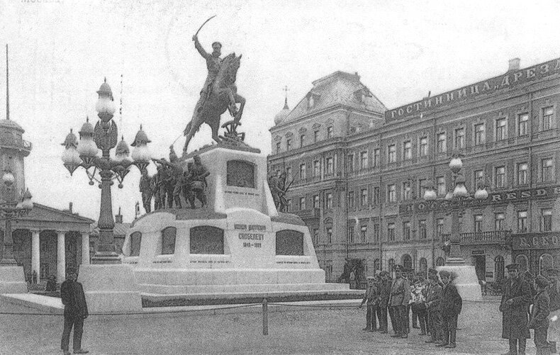 И потом, статуя полководца на вздыбленном коне по традиции означает, что он погиб на поле боя. Если у лошади поднята одна нога, умер от ран. Если стоит на четырех, умер своей смертью. Скобелев умер на проститутке. |