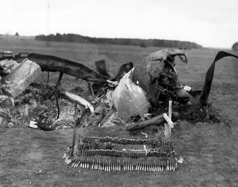 Не понимаю я мрачного тевтонского гения. Ну, ладно бы на Родину отвезли покойника, коль уж он так славен был в околомузыкальных кругах. А так... Привезти к месту нахождения сбитого самолёта и там закопать? Зачем? Сам-то самолёт наверняка вскорости эвакуировали или просто тупо разобрали на металлолом.